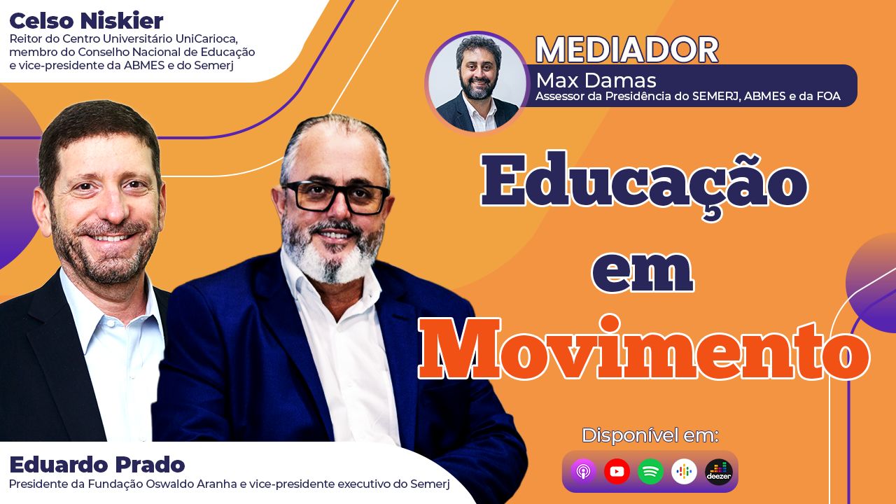Com a participação de Celso Niskier (CNE/UniCarioca/SEMERJ) e Eduardo Prado (FOA/SEMERJ), sob mediação de Max Damas, debatemos como a liderança acadêmica pode ser fator estratégico para a inovação, a sustentabilidade e a qualidade no ensino superior.